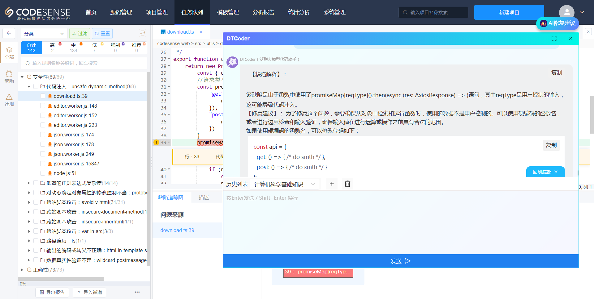 CodeSense已接入研发能效大模型DTCoder,支持自动获取智能缺陷描述和修复建议,修复建议中代码片段可直接用于修复缺陷,大幅降低缺陷理解与修复难度。